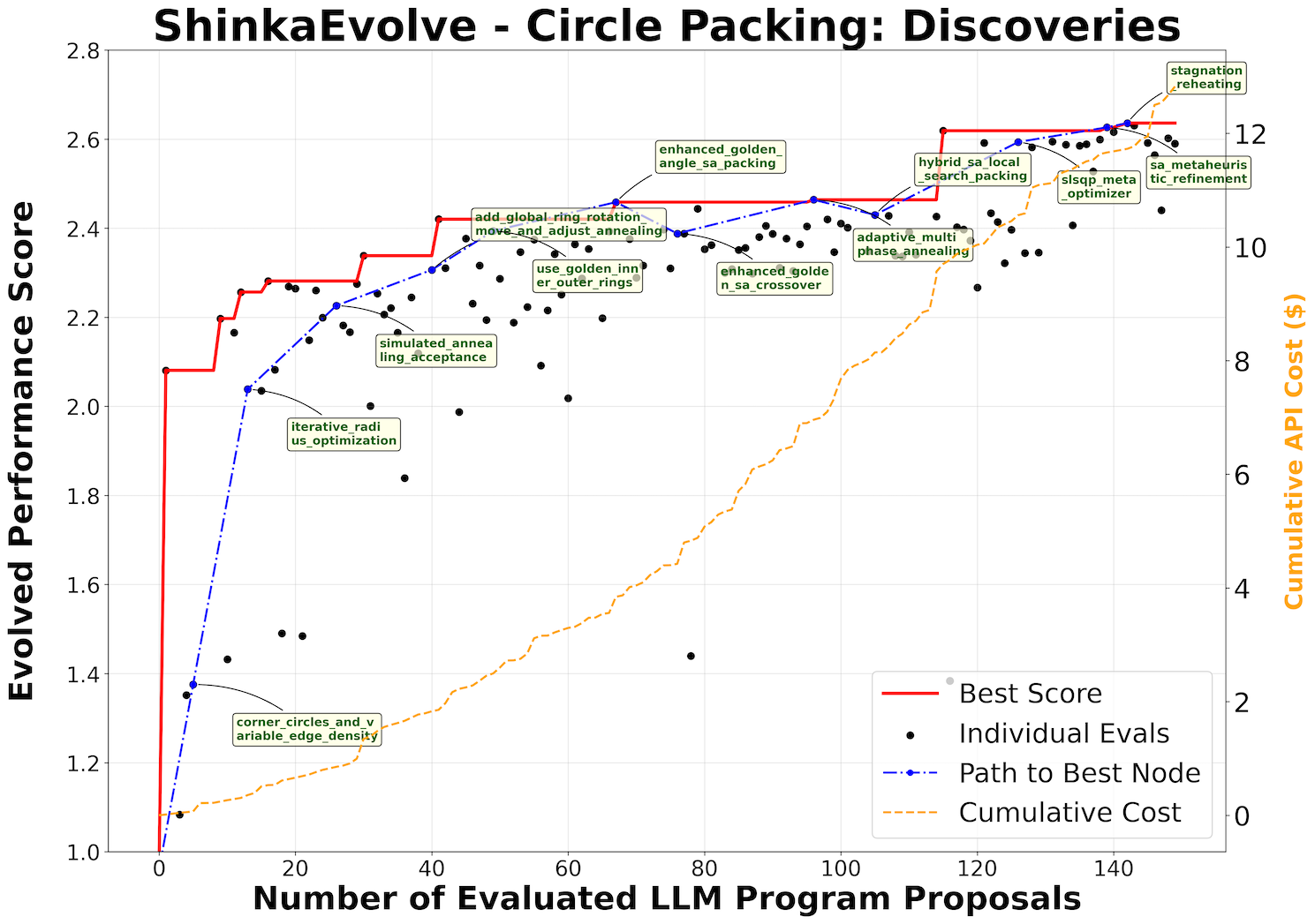 ShinkaEvolve discovered a new state-of-the-art solution for the classic 26-circle packing problem using only 150 samples. As you can see in the chart from our paper, this is a massive leap in efficiency compared to prior work. The discovered algorithm is a sophisticated hybrid of a golden-angle spiral initialization, gradient-based refinement, and simulated annealing to escape local optima.