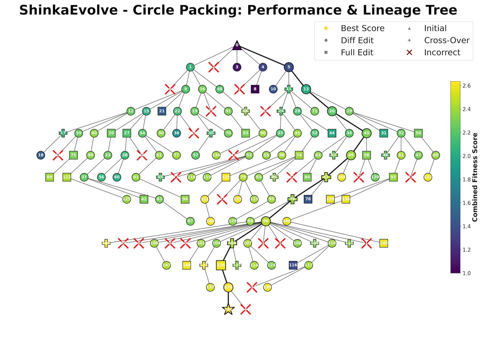 We introduce ShinkaEvolve, an evolutionary code optimization framework, which discovers new algorithms with LLMs and achieves unprecedented sample efficiency. In the above on the left, we demonstrate the progress of the challenging Circle Packing task, and visualize the path of evolutionary program search to the best program on the right.
